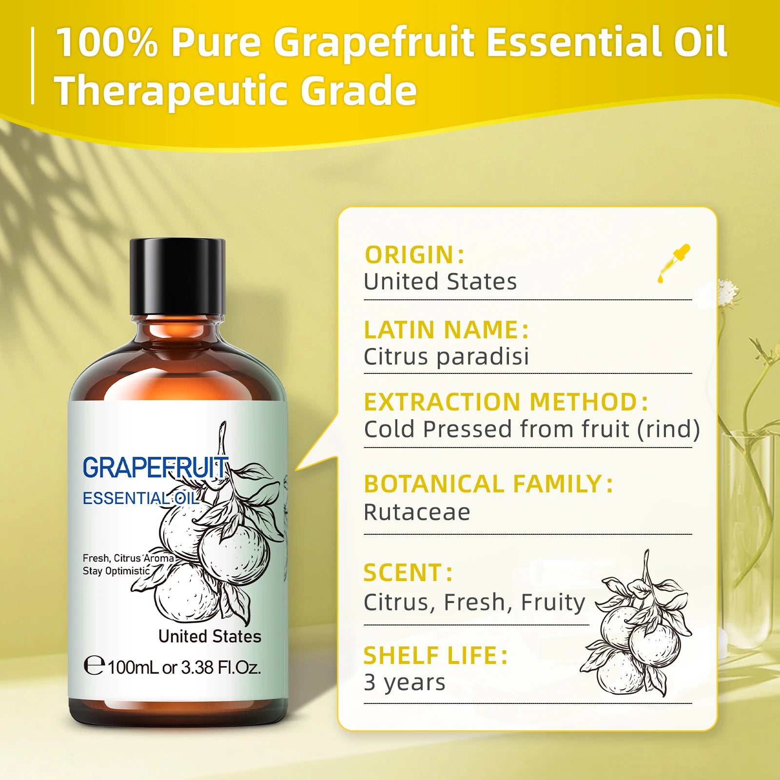 - Cold-pressed from grapefruit rind to capture a fresh, zesty fragrance.